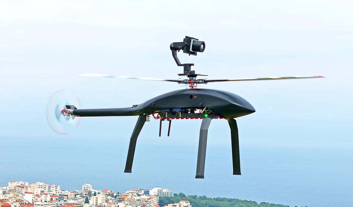 The Velos V3 is the latest generation of the company’s Group II unmanned helicopters. Designed with a traditional rotorcraft layout, a three-bladed main and tail rotor, and a robust carbon-fiber fuselage, it offers more than an hour of flight time and up to 10 kg (22 lbs) of payload capacity. Its patented twin-transmission design provides unmatched redundancy and operational safety, setting a new standard in the 25 kg (55 lbs) class.