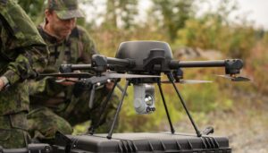 Patria SKY is a secure drone system designed for official use, approved by Finnish authorities. It offers encrypted radio transmission, does not require registration or external updates, and features adjustable radio power. The system includes easily interchangeable payloads and robust weather protection for all major components.