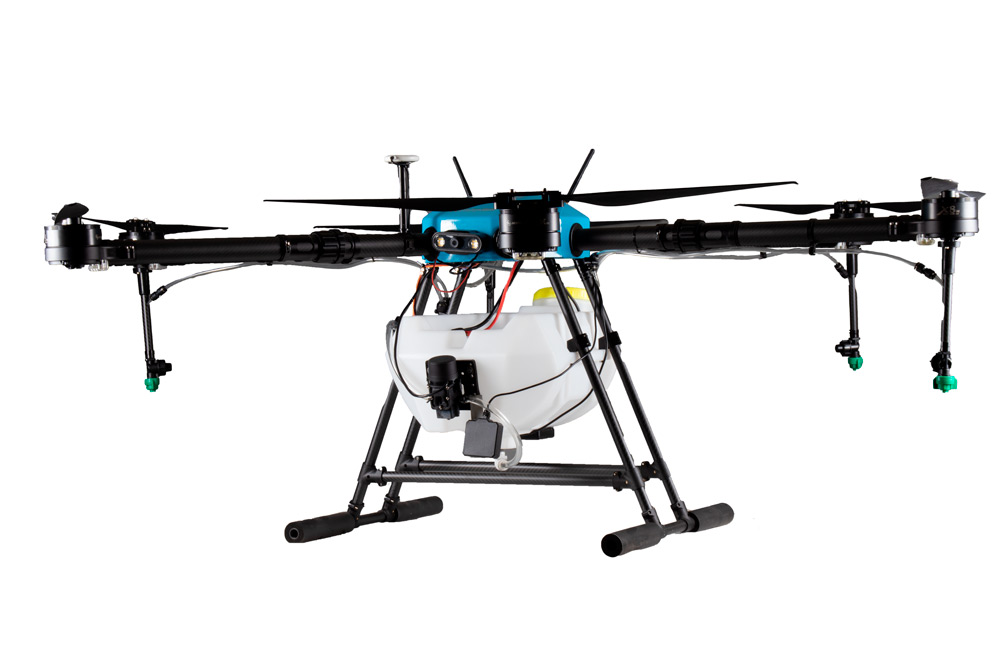The Reactive Drone Agric RDE616T is a 20-liter, 6-rotor electric UAV designed for spraying agricultural fields with agrochemicals, fertilizers, and micronutrients.